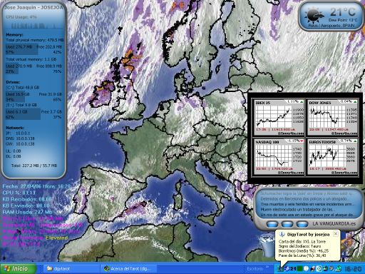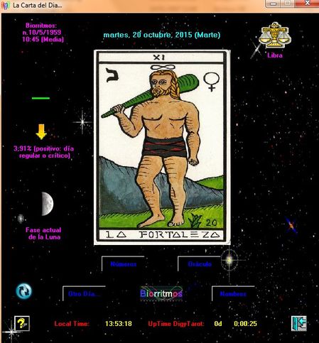 Primero de todo hay de decir que este programa no pretende influir en el acontecer sino que su afán es puramente didáctico, el autor no se hacer responsable de ninguna decisión tomada a través del mismo. El programa consta de seis módulos o paneles principales. En el primero y que sale por defecto nos encontramos "La carta del Día", la que corresponde a esa fecha particular (sólo se han tenido en cuenta los arcanos mayores). Tenemos un resumen de los biorritmos, el signo del zodiaco actual, las fases de la Luna (con detalle incluído), el planeta que corresponde al día de la semana actual, etc. Este módulo nos da una visión general de la situación. Desde opciones podremos elegir entre tres barajas del Tarot.