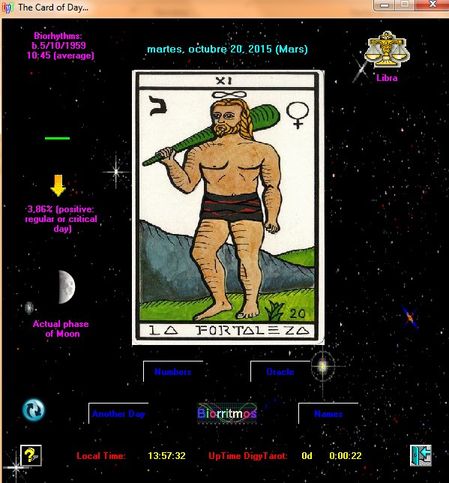 First of all I have to say that this program is not intended to influence the events but that its goal is purely didactic, the author did not make liable for any decision taken through this program. The programme consists of six modules or main panels. In the first and that goes by default we find "The Card of the Day", which corresponds to the current date (only have been taken into account the major arcana). We have a brief of biorhythms, the currently zodiacal sign, the Moon phases (with a very exhaustive detail), the planet that corresponds to the actual day of week, etc. This module gives us a general vison of the situation. From options you can choose between three decks of Tarot.