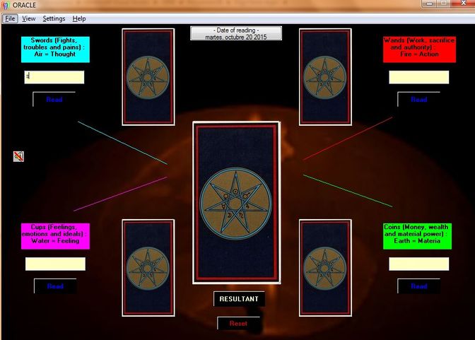 Finally we have an "oracle": there are 4 text box corresponding to the 4 suits of deck, each box corresponds to a suit. Each suit has an own meaning and therefore a different interpretation (so for example if we want to do a question of sentiments we will have to go to the cups, of sacrifice to wands, conflicts to swords, material matters to coins), to find out the corresponding card we will insert a key word or phrase according to the question we want to do (commas, points, question marks, exclamation marks... they can be put but the program does not take into account, numbers in change also we have it in mind), when we accept we have its corresponding image. This can be made for a suit or several according to the interest of our consultation. Since a consultation can be refer to a fact past, present or future we must put the date in the top (by default the programme will take the current date), time therefore is another factor to be counted in our consultation (it's not the same a question done today than tomorrow, or any other day). Then pressing where it puts "RESULTANT" we will obtain for the required date the corresponding card for the major arcana in conclusion mode, if we press over the image we will obtain a brief interpretation in the top text box. The most audacious have the possibility to obtain through an aleatory system a real throw (through options menu) . By default the program begins with the objective throw but then if we opt for the real one the program will remind it the next time. The difference between one an another is that the real throw considers the inverted cards too, while the objective don't (the real throw is therefore much more dangerous). Whether in this module and in the numbers and names you can save the results , we can also choose whichever melody in mid format to listen when the oracle starts.